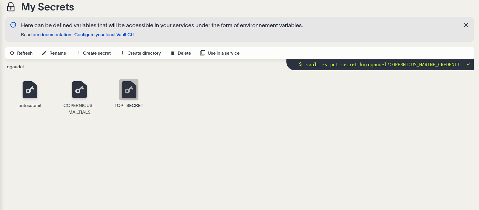 On the platform, environment variables are treated as secrets stored in Vault (the EDITO secret management component) and are encrypted. This enables you to store tokens, credentials, and passwords securely. The My secrets page is designed like a file explorer, allowing you to sort and organize your variables into folders.