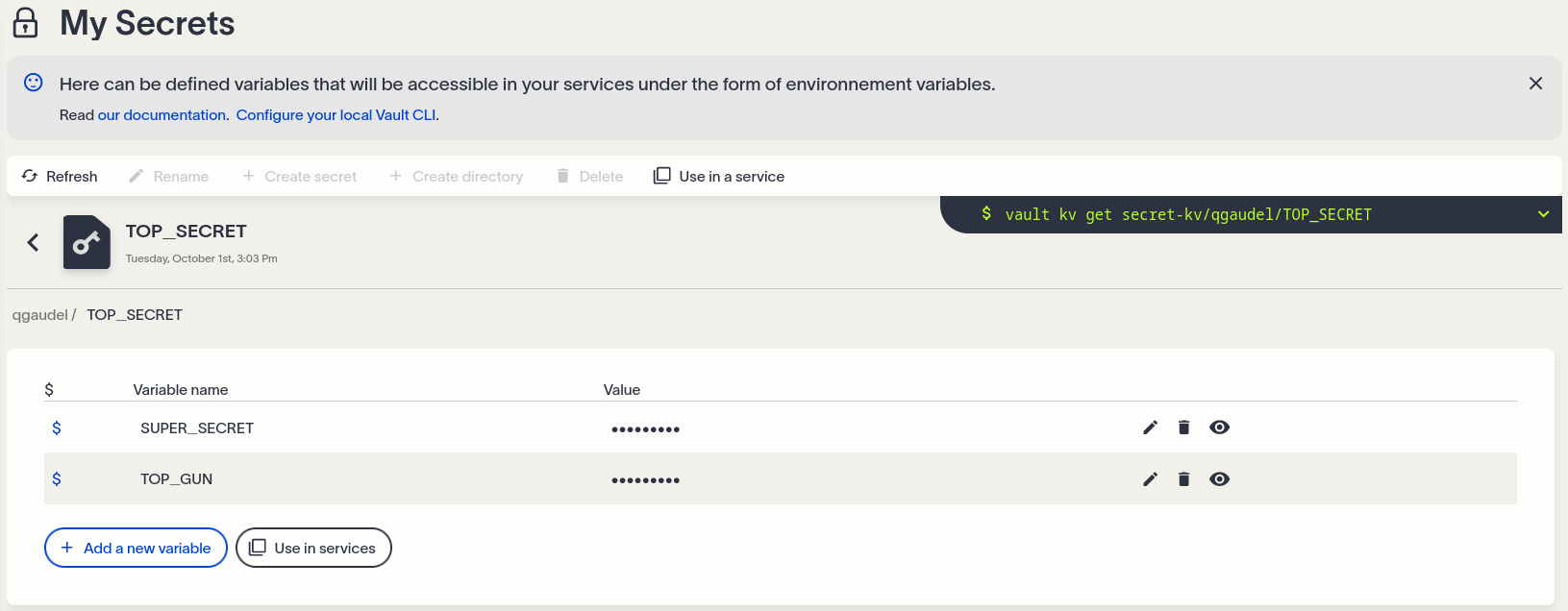 Once your secret is edited, along with its different variables, you are ready to use it in your service or process. Let’s try it in a service: